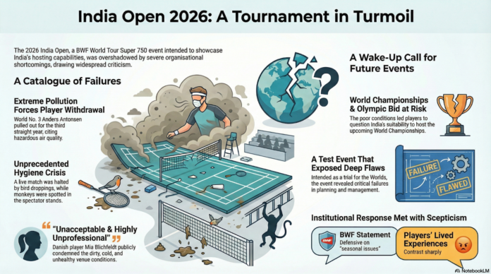The India Open 2026 was a tournament of unmet expectations that exposed the friction between India’s athletic potential and its administrative reality. While the BWF claims the Indira Gandhi Indoor Stadium meets “Field of Play” requirements, the image of monkeys in the stands and hazardous air in the lungs tells a different story. As New Delhi prepares to host the World Championships in August, the global federation faces a crisis of integrity: should a city be allowed to host a marquee event when it cannot guarantee a healthy, animal-free environment for its athletes? If the lessons of this “test event” are dismissed as mere “allergies,” the badminton world may find that India is simply not yet ready for the world stage.