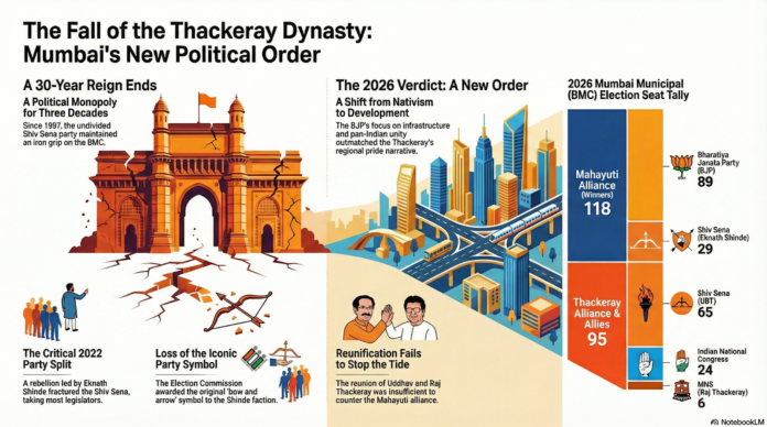 The January 15, 2026, Brihanmumbai Municipal Corporation (BMC) election was not merely a civic exercise; it was the final stage of a long-gestating structural decay. With a voter turnout of 52.94%, the electorate participated in the systematic dismantling of a political dynasty that had held an iron grip on the city since its 1997 baseline dominance of 103 seats.