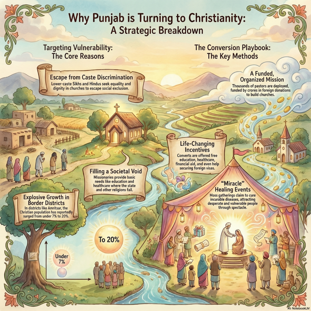 What appears to be a circus of superstition on screen is, in reality, a manifestation of a deep systemic failure in one of India’s most culturally proud states. Ground reports and statistical estimates suggest that Punjab is witnessing a wave of religious conversion so massive that in some border villages, the demographic makeup has flipped entirely. This is not just about faith; it is about economics, caste discrimination, foreign funding, and the desperate aspirational fatigue of a state that has lost its way.